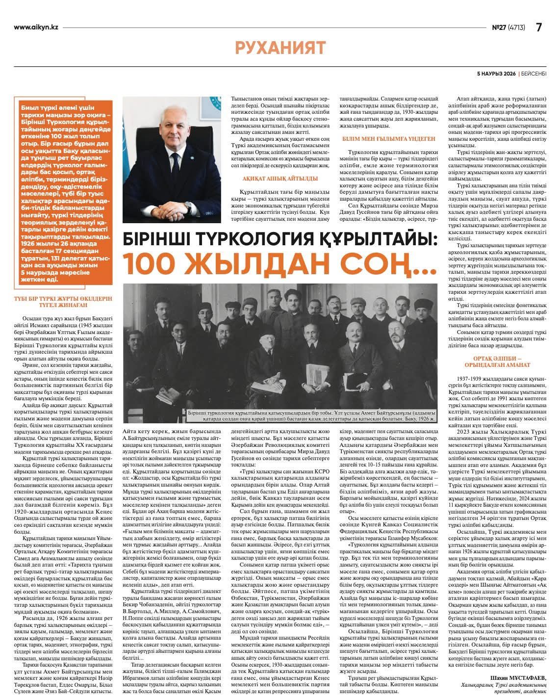 Qazaxıstanın "Aiqyn" qəzetində Beynəlxalq Türk Akademiyasının prezidenti, akademik Şahin Mustafayevin Bakıda keçirilmiş türk dünyası üçün çox böyük tarixi əhəmiyyətə malik olan Birinci Türkoloji Qurultayın 100 illiyinə həsr edilmiş “Birinci Türkoloji Qurultay: 100 il sonra” adlı məqaləsi dərc olunub.